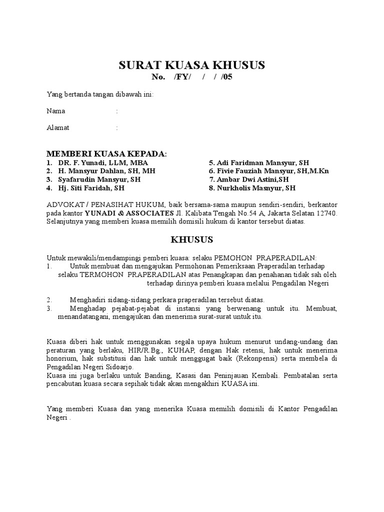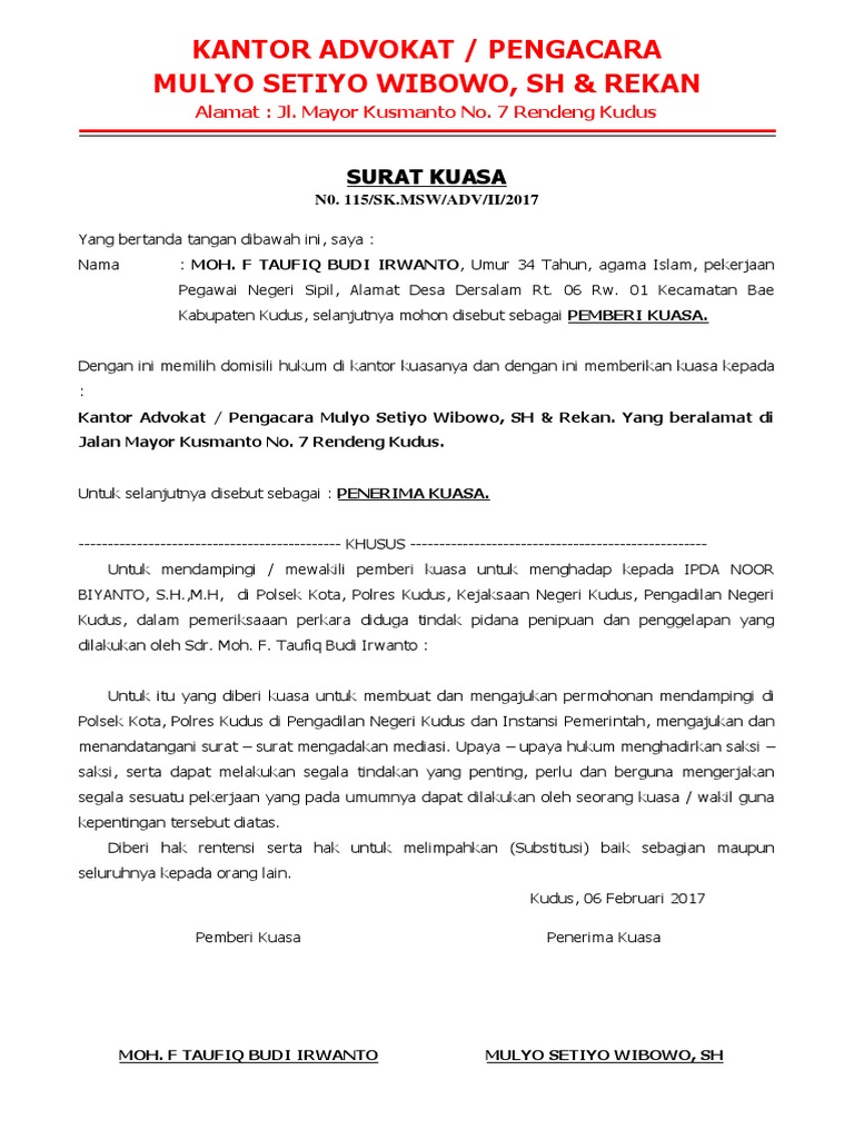 Untuk dan atas nama pemberi kuasa guna mewakili, mendampingi dan membela kepentingan pemberi kuasa selaku terdakwa di pengadilan negeri jakarta selatan, berdasarkan register nomor : Surat kuasa adalah surat yang isinya mengenai pemberian wewenang atau kuasa dari seseorang atau satu pihak kepada orang lain atau pihak lain untuk melakukan suatu hal seperti yang tertera dalam isi surat. Surat kuasa kedinasan adalah surat kuasa yang dibuat oleh suatu perusahaan atau instansi (baik pimpinan maupun pejabatnya) yang diberikan kepada bawahannya untuk melakukan pekerjaan yang berhubungan dengan perusahaan atau instansi tersebut. Yang bertandatangan dibawah ini : Contoh surat kuasa adalah surat yang didalamnya berisikan pemberian kuasa kepada seseorang yang telah dipercaya. Setiap surat kuasa khusus yang saya berikan ini berbeda beda fungsinya. Contoh surat kuasa pengacara untuk kepengurusan hukum contoh surat kuasa pengambilan uang di bank bni, mandiri, bca, bri Misalnya surat kuasa untuk perwakilan pengambilan ijazah, pengambilan uang gaji. Surat kuasa khusus via contoh.pro. Surat tersebut berguna untuk membuktikan jika penerima kuasa berhak untuk mengatasnamakan pemberi. Contoh surat kuasa yang benar dan turorial lengkap cara membuatnya. Surat kuasa khusus adalah pemberian kuasa yang dilakukan hanya untuk satu kepentingan tertentu atau lebih. Pada gambar contoh di atas surat kuasa khusus pidana tersebut di berikan oleh terdakwa yudi setiawan kepada empat pengacara yang berasal dari law office fidelangwarmasse & partners yang bertujuan untuk mengurus hal terkait dengan kasus dugaan korupsi yang di tujukan kepadanya.